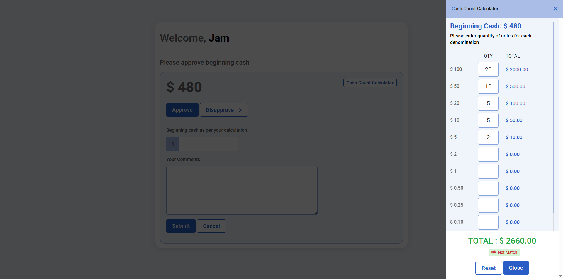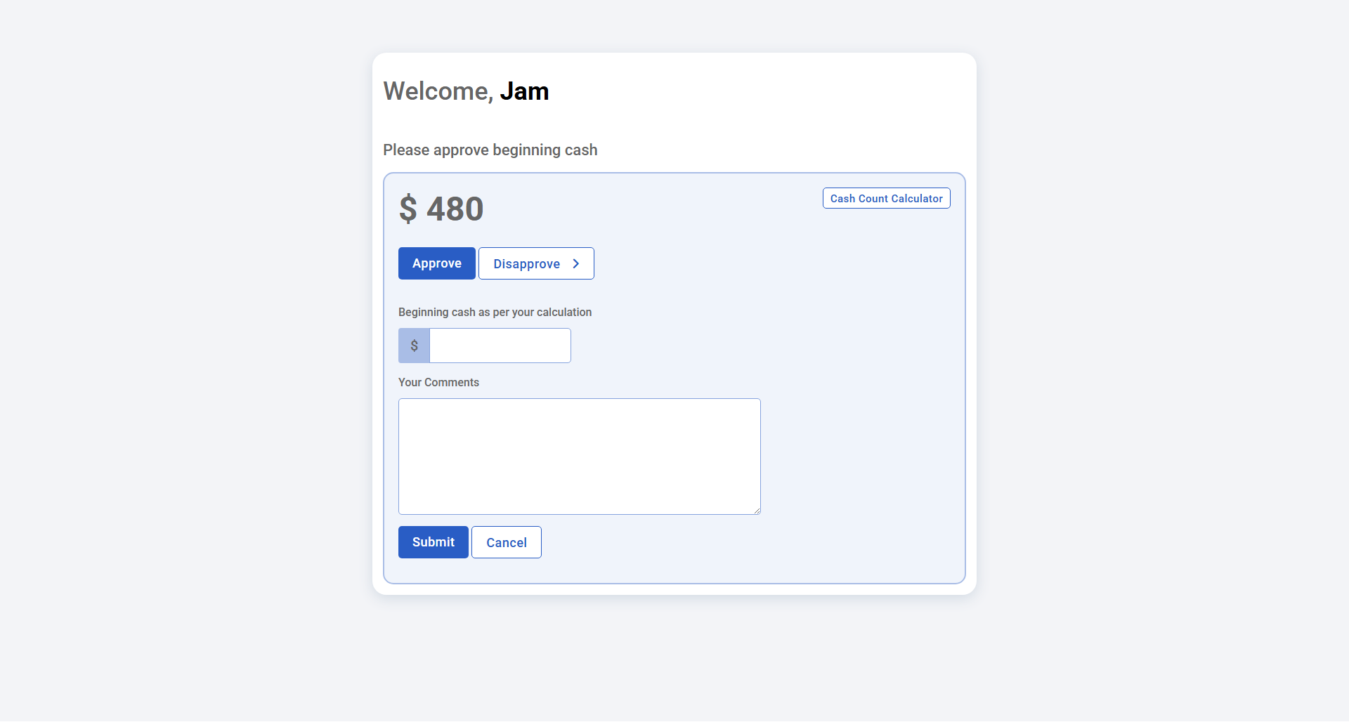 • Cash Count Log – Track beginning/end cash, drop amount, discrepancies, and shift-wise verification.
