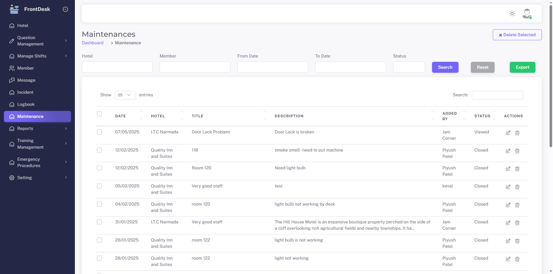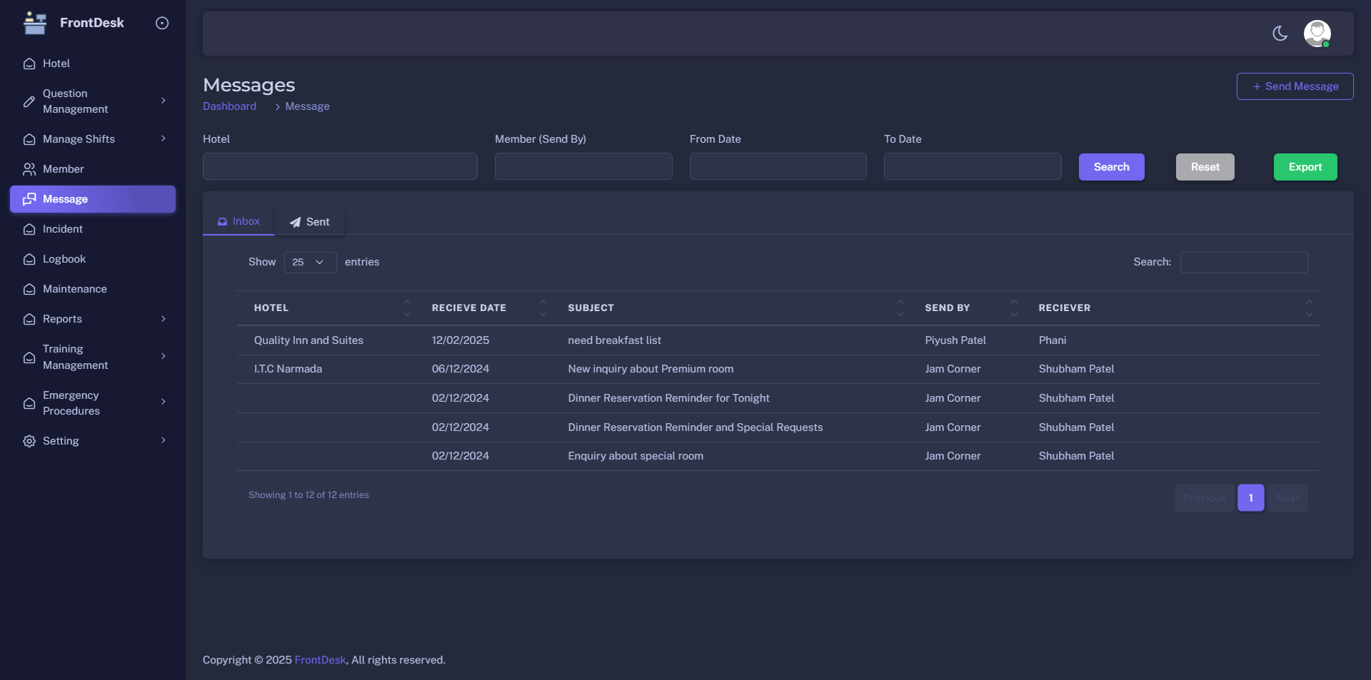 This project aims to digitally transform the front desk operations of hotels by replacing manual, paper-based processes with a centralized web-based system. It includes modules for shift management, cash log tracking, incident reporting, training, messaging, and maintenance coordination. The system supports hotel-specific customization, ensuring flexibility across multiple properties
