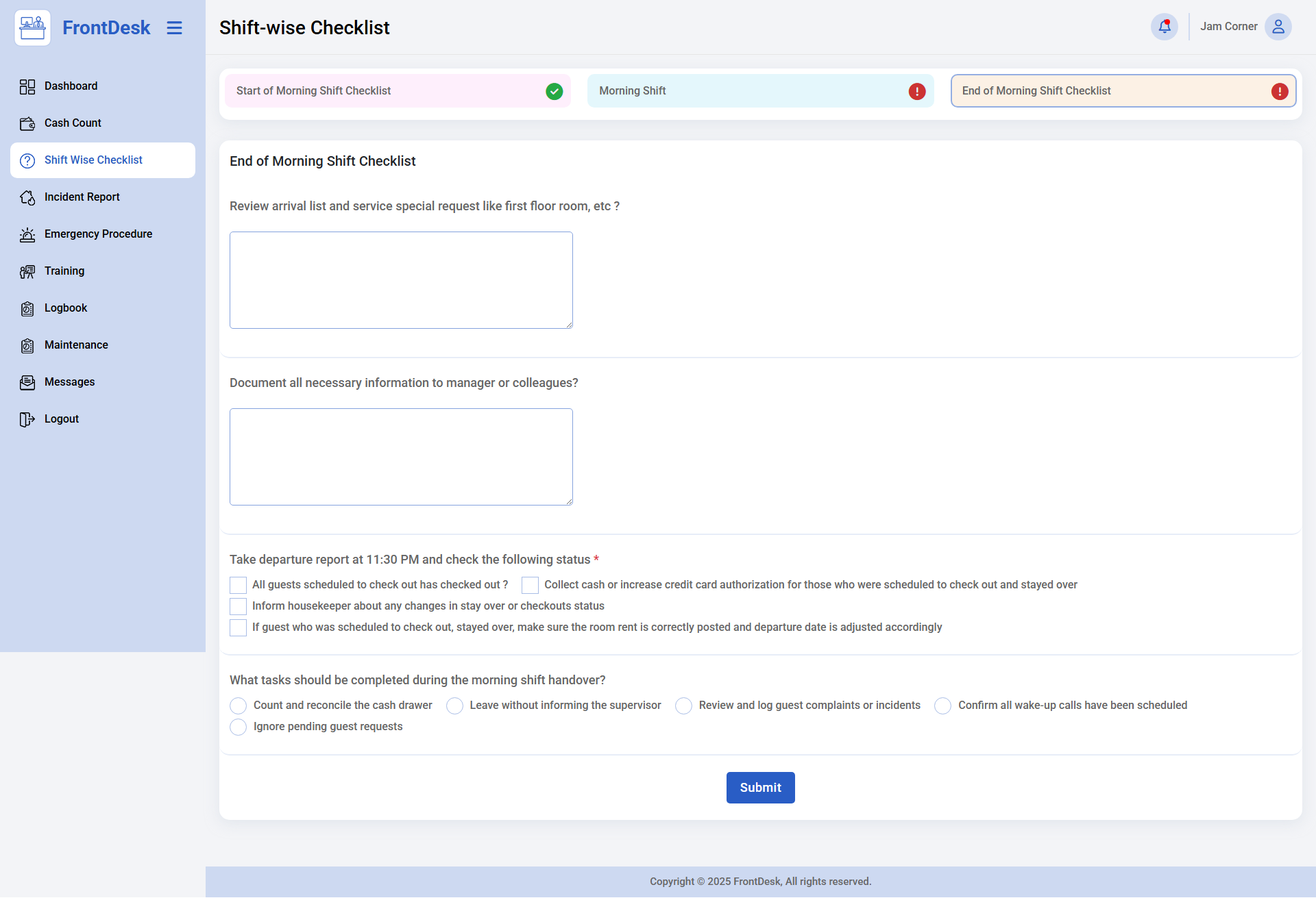 • Shift Management – Customizable checklists, shift-specific questionnaires, and cash handover verification.